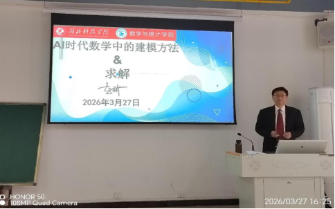 为提升师生数学建模能力,备战2026年全国大学生数学建模竞赛,3月27日,数学与统计学院邀请湖北工业大学赵斌教授作题为《AI时代数学中的建模方法与求解》的专题报告。学院师生代表参加活动,共同探讨人工智能与数学建模的深度融合。本次活动得到湖北科技学院科学技术协会支持。